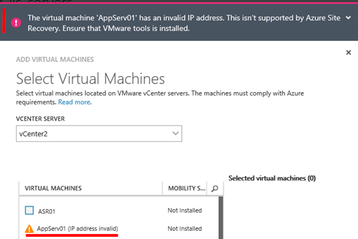 Na obrátku pak vidíte ukázku toho, že ASR si detekuje i různé stavy virtuálních strojů v On-premise prostředí. V tomto případě nemůžeme přidat do skupiny virtuální stroj, protože na neplatnou IP adresu.