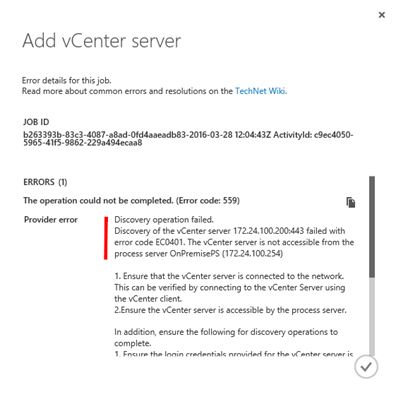 Pravděpodobně i v případě této akce, tedy přidání vCenter serveru, nepotřebujete mít navázánu/funkční Site-to-Site VPN (případně ExpressRoute). Pokud se spletete a zadáte např. špatnou IP adresu vCenter serveru, dojde v rámci spuštěné úlohy v sekci “JOBS” k vygenerování chyby. A ta říká, že vCenter, který chcete přidat, musí být dostupný přes výchozí port TCP 443 z Process/management serveru v On-Premise prostředí.