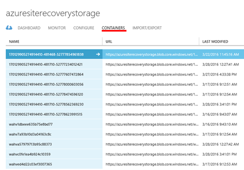 Zde pak ukázka obsahu storage account, kam jsou replikovány virtuální stroje.