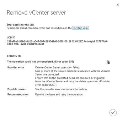 Pokud se rozhodnete odebrat stávající vCenter server, musíte nejprve zrušit replikaci všech virtuálních strojů, které jste přidaly „skrze“ toho vCenter, viz chyba níže.