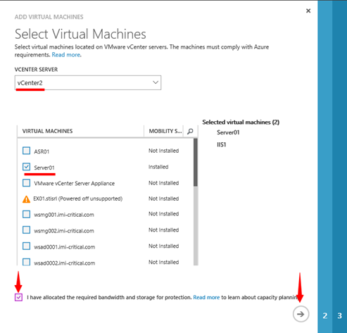 V průvodci přidáním virtuálních strojů nejprve vybereme správný vCenter server. Na základě výběru vCenter serveru, se nám načte seznam virtuálních strojů. Upozornění: Seznam virtuálních strojů je ovlivněn standardním 15 minutovým oknem, v rámci kterého dochází k načítání dat z management serveru. Tedy pokud vytvoříte virtuální stroj a vzápětí jej budete chtít přidat, v seznamu virtuálních strojů jej neuvidíte. To lze řešit pomocí tlačítka „REFRESH“, viz také postup popsaný výše v článku. Zde je vidět, že je možnost vybrat pouze ty virtuální stroje, které jsou podporovány. Standardně to nejsou všechny virtuální stroje, které jsou vypnuté. Což je logické, protože PROCESS SERVER, potřebuje vzdáleně na tyto virtuální servery instalovat Mobility service. Vybereme konkrétní podporované virtuální stroje a dále musíme souhlasit s tím, že jsme si vědomi náročnosti replikace a jejího dopadu na naši infrastrukturu.