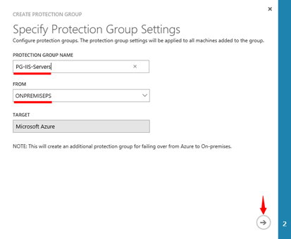 V průvodci přidáním „PROTECTION GROUP“ zadejte nejprve název nové skupiny do pole „PROTECTION GROUP NAME“. Dále v poli „FROM“ vyberte odkud se budou virtuální stroje replikovat. V mém případě jsem vybral management server „ONPREMISEPS“. Přičemž cíl je v tomto případě Azure a nelze jej změnit.
