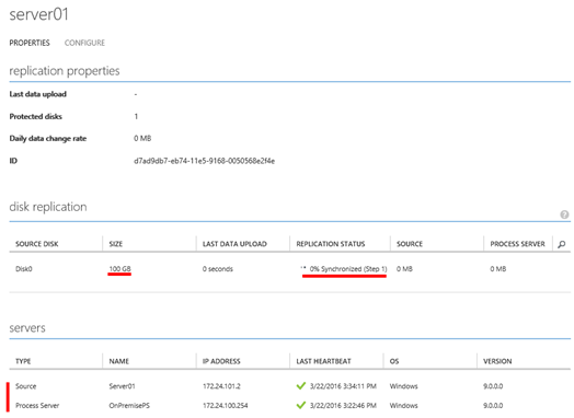 Jakmile je úspěšně dokončena instalace Mobility service, dochází k replikaci dat do Azure. Na obrázku je podrobně vidět jaké disky se replikují, kdo je zdroj dat a jaký proces server tyto data zpracovává.