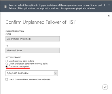 Ukázka Failover procedury, kdy si vybereme „Custom recovery point“.