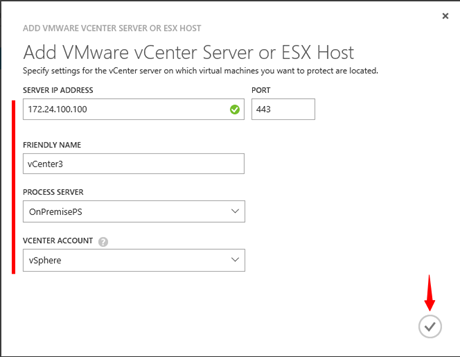 V okně pro přidání vCenter serveru doplňte údaje vašeho On-Premise vCenter serveru. Jako Process server jsem vybral On-Premise server „ONPREMISEPS“ a v rámci položky „VCENTER ACCOUNT“ jsem vybral v předchozím kroku vytvořené/definované pověření.